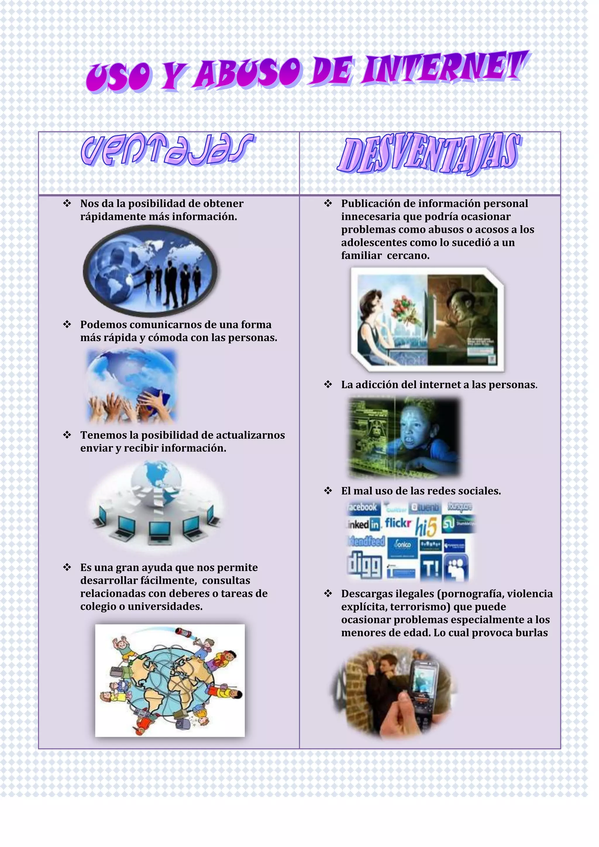 El documento discute los pros y contras del uso del internet, destacando la rápida comunicación y el acceso a información, pero también menciona los riesgos como el acoso y la adicción. Se menciona cómo el mal uso de las redes sociales puede llevar a problemas serios, especialmente para los jóvenes. A pesar de los beneficios en tareas y conexiones familiares, se advierte que el uso irresponsable del internet puede tener consecuencias perjudiciales para la privacidad y la salud mental.