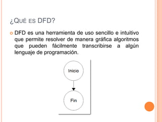 DFD es una herramienta gratuita que permite resolver algoritmos mediante diagramas de flujo de forma gráfica y sencilla sin necesidad de usar un lenguaje de programación específico. DFD facilita el aprendizaje de estructuras y funciones comunes en programación como variables, funciones matemáticas, ciclos y decisiones mediante su uso intuitivo. Los diagramas creados en DFD pueden transcribirse fácilmente a cualquier lenguaje de programación.