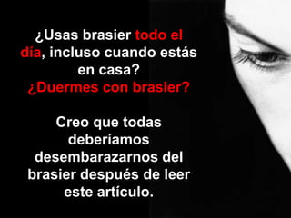 El documento sugiere que el uso prolongado de sostenes apretados puede estar relacionado con un mayor riesgo de cáncer de mama, debido a que los sostenes pueden obstruir los conductos linfáticos del pecho y evitar que el cuerpo elimine toxinas. Se cita un estudio estadounidense que encontró que las mujeres con cáncer de mama usaban sostenes más ajustados y por más tiempo que las mujeres sin la enfermedad. El documento insta a las mujeres a no usar sostenes apretados y, de preferencia, a
