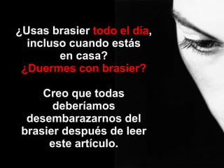 Este documento discute los posibles peligros de usar brasieres apretados por mucho tiempo y sugiere que esto puede estar relacionado con un mayor riesgo de cáncer de mama. Señala un estudio que encontró que las mujeres con cáncer de mama usaban brasieres más apretados y por más horas que las mujeres sin cáncer. Recomienda no usar brasieres apretados y preferiblemente dormir sin brasier, ya que esto puede mejorar la salud de los senos. Finalmente, pide informar a otras mujeres sobre los posibles peligros de usar bras