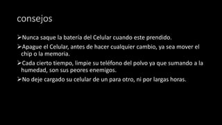 Este documento contiene recomendaciones sobre el uso adecuado del teléfono celular para prevenir problemas de salud y accidentes. Se aconseja hablar por cortos períodos de tiempo, usar auriculares en lugar del altavoz y evitar usar el celular mientras se conduce o cerca de la cabeza cuando se duerme. Los especialistas también recomiendan que los niños no usen celulares.