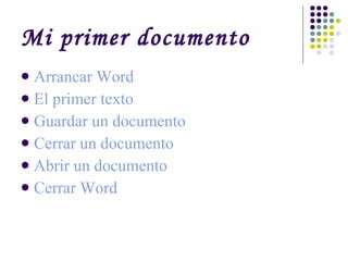 Este documento proporciona instrucciones sobre cómo usar Microsoft Word para crear y editar documentos. Explica cómo iniciar Word, escribir texto, guardar y abrir documentos, cerrar documentos y Word, y describe los elementos básicos de la interfaz de usuario como los menús, las barras de herramientas y la barra de formato.