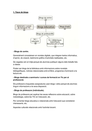 El documento describe los usos educativos de los blogs. Explica diferentes tipos de blogs como blogs de centro, de profesores individuales, y de aula. También describe herramientas de la Web 2.0 como wikis y foros de discusión que pueden integrarse en los blogs. Explica plataformas populares para blogs y tipos de actividades y entradas que pueden realizar profesores y estudiantes a través de los blogs.