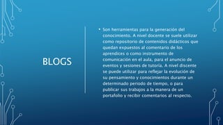 Este documento describe varias herramientas digitales y sus usos educativos potenciales. Menciona que los blogs pueden usarse como repositorios de contenido educativo o para que los estudiantes publiquen su trabajo y reciban comentarios. Indica que los wikis fomentan la colaboración al eliminar jerarquías y permitir que cualquier persona edite contenido desde cualquier lugar. También describe cómo los podcasts y vodcasts permiten el aprendizaje a demanda y cómo las redes sociales y mundos virtuales pueden usarse para la simulación y el aprendizaje
