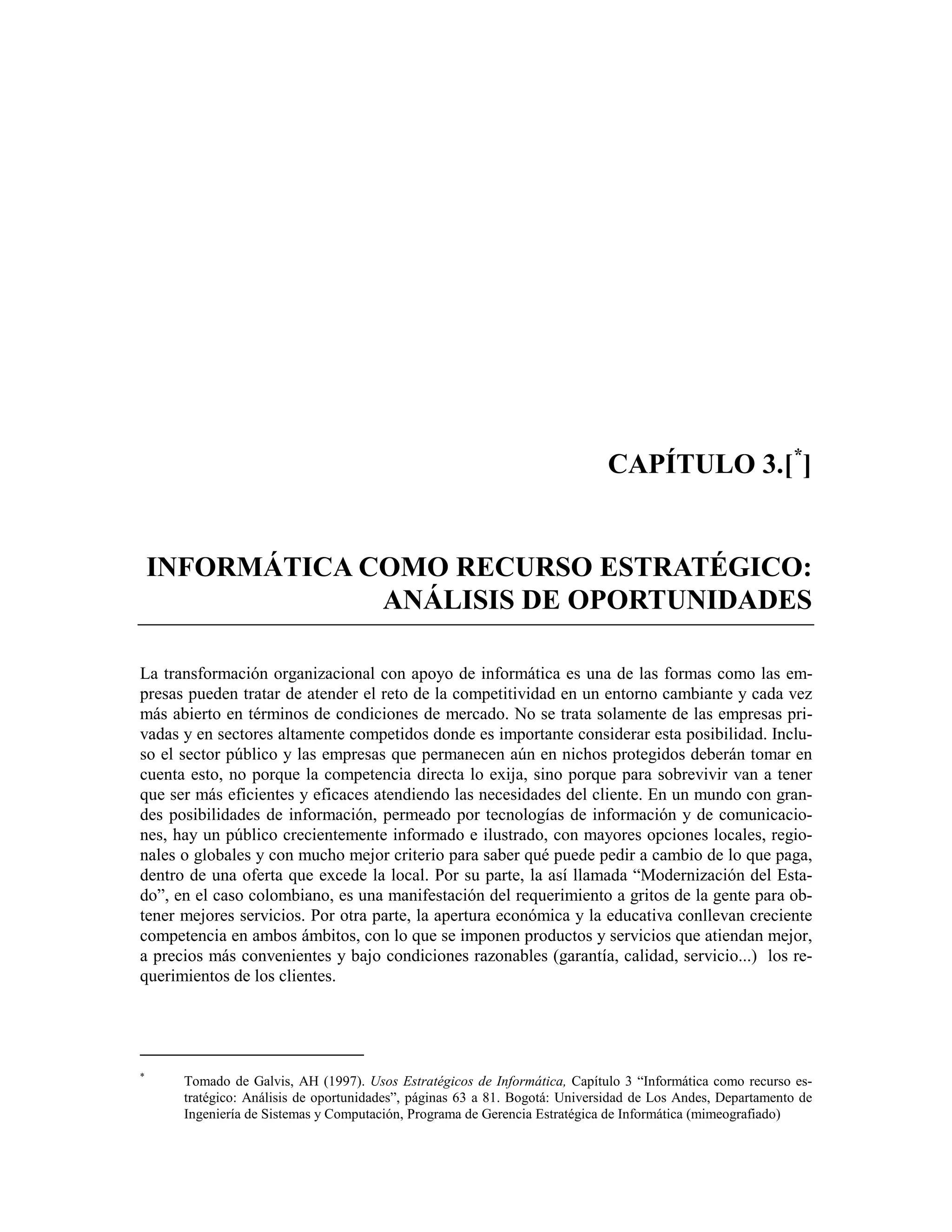 El capítulo 3 aborda cómo la informática puede ser un recurso estratégico para las empresas en un entorno competitivo en constante cambio, destacando la importancia de la eficiencia y efectividad en la atención al cliente. Se enfatiza que la transformación organizacional con tecnología debe estar alineada con las estrategias de negocio para lograr ventajas competitivas sostenibles. Además, se menciona la necesidad de adaptarse a la globalización y a un contexto tecnológico que exige innovación y flexibilidad en las organizaciones.