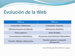 Este documento resume la evolución de la web de la Web 1.0 a la Web 2.0 y la Web Social, destacando cómo los usuarios pasaron de ser meros consumidores de contenido estático a generadores y compartidores de información dinámica de forma colaborativa. También analiza los esfuerzos que deben realizar los archivos para ampliar su visibilidad y participación en Internet a través de redes sociales y contenidos ajustados a su público, así como las habilidades y herramientas digitales que pueden utilizar para difundir noticias