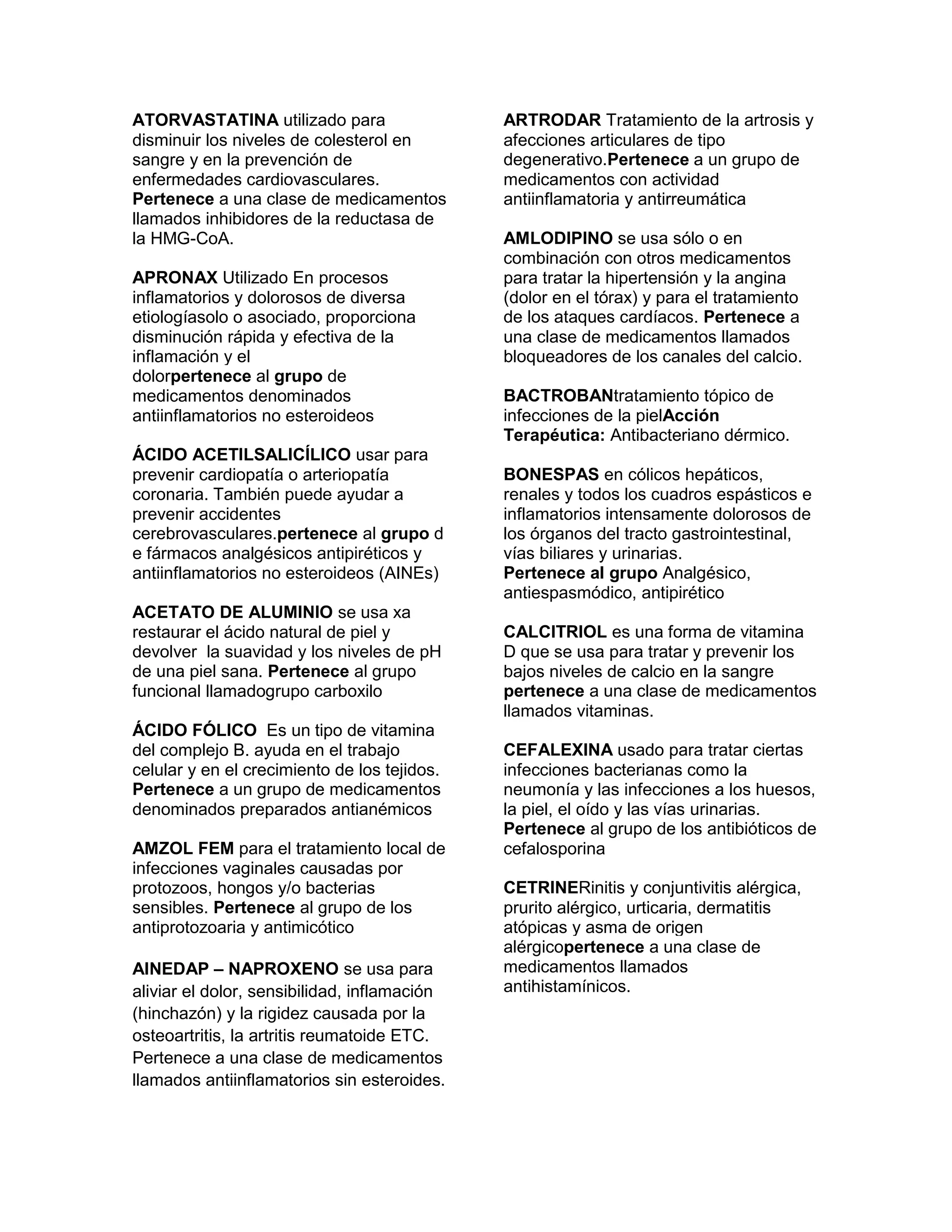 El documento proporciona información sobre varios medicamentos, incluyendo sus usos, clasificaciones y grupos funcionales. Describe brevemente las indicaciones, mecanismos de acción y clasificaciones de medicamentos como antiinflamatorios, antibióticos, anticonvulsivantes y otros.