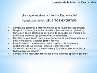 Este documento describe los grupos de usuarios de la información contable y para qué les sirve dicha información. Los usuarios pueden ser externos o internos a la empresa. Los usuarios externos incluyen accionistas, prestamistas, empleados y el público en general, mientras que los usuarios internos son los directores y mandos intermedios. La información contable les sirve a ambos grupos para tomar decisiones financieras y de negocios.