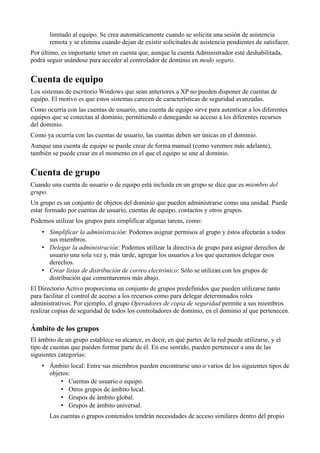 Este documento describe los conceptos básicos de usuarios, grupos y equipos en Windows 2008 Server. Explica que las cuentas de usuario, grupo y equipo permiten autenticar y autorizar el acceso a recursos de la red. También describe los tipos de grupos integrados que se crean durante la instalación como Administradores, Operadores de copia de seguridad y Usuarios, así como sus derechos y permisos predeterminados. Finalmente, explica los diferentes ámbitos de los grupos y los tipos de grupos como de distribución y seguridad.