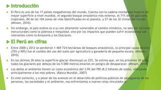 El documento describe la biodiversidad y vulnerabilidad al cambio climático del Perú. Se han perdido hectáreas de bosque amazónico y glaciares, con costos económicos. La educación ambiental es clave para formar ciudadanos responsables que contribuyan al desarrollo sostenible. La política y el plan nacional de educación ambiental guían esta implementación a través de proyectos en las escuelas.