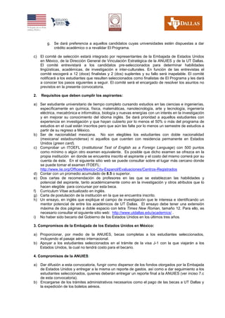Este documento es una convocatoria para un programa de investigación de verano en la Universidad de Texas en Dallas (UT Dallas), emitida por la Embajada de Estados Unidos en México en colaboración con la Asociación Nacional de Universidades e Instituciones de Educación Superior de México (ANUIES) y UT Dallas. La convocatoria detalla los requisitos para los estudiantes mexicanos interesados en participar en el programa de seis semanas de duración en el verano de 2015, así como los compromisos de las diferentes instituciones involucradas.