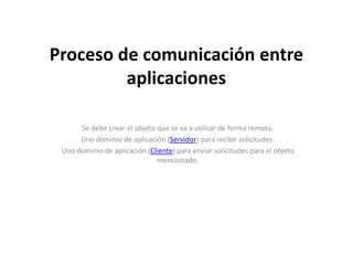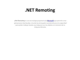 .NET Remoting permite crear aplicaciones distribuidas al posibilitar el acceso a objetos en memoria de máquinas remotas. Se debe crear un objeto remoto, un dominio de aplicación servidor para recibir solicitudes y un dominio cliente para enviar solicitudes. Windows Communication Foundation provee un modelo unificado para generar aplicaciones orientadas a servicios seguras entre plataformas. CORBA establece una plataforma para invocar métodos remotos bajo un paradigma orientado a objetos de forma multiplataforma y define servicios como seguridad y transacciones.
