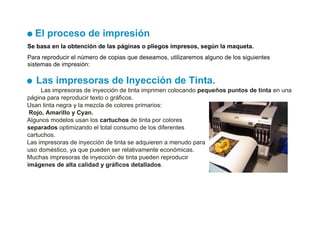 El documento describe los diferentes sistemas de impresión, como las impresoras de inyección de tinta, láser y offset, destacando sus características y aplicaciones. La impresión digital se menciona como una tecnología eficiente que permite tiradas cortas y personalización de documentos, mientras que la impresión offset es ideal para grandes cantidades con alta calidad. También se abordan los plotters y su uso en impresiones de grandes formatos, así como los métodos de impresión asociados a cada tipo de máquina.