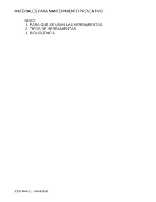 Este documento describe los materiales necesarios para el mantenimiento preventivo de equipos de cómputo, incluyendo diferentes tipos de herramientas como destornilladores, sopladoras, pulseras antiestáticas, brochas, pinzas y alcohol isopropílico. Explica cómo usar cada herramienta para limpiar y desmontar con cuidado las partes internas de una computadora y eliminar el polvo sin dañar componentes delicados.