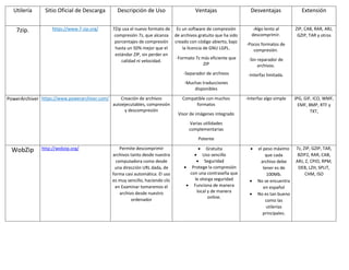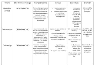 El documento proporciona una comparación de varias utilerías de compresión de archivos, incluyendo 7zip, PowerArchiver, WobZip, HandyBits Zip&Go, Freecompresor, OnlineZip, WinRAR, IZArc, WinAce y PeaZip. Cada una se describe brevemente con su sitio web, descripción de uso, ventajas, desventajas y formatos compatibles. La mayoría son gratuitas y compatibles con formatos comunes como ZIP, RAR, 7z, pero algunas tienen funciones adicionales como compresión más eficiente