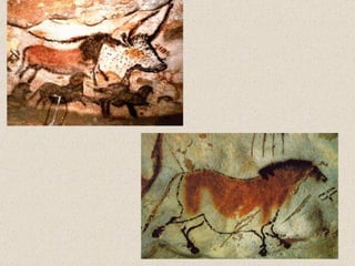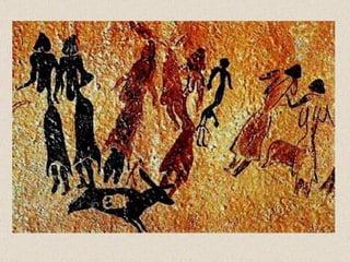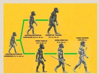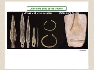 Este documento describe varias herramientas y útiles prehistóricos, incluyendo formas de hacer fuego, armas de caza como flechas y lanzas, hachas de piedra, molinos, instrumentos musicales, recipientes para agua, y formas tempranas de arte como ídolos, grabados rupestres y entierros. Cubre el período desde la Edad de Piedra hasta la Edad de Bronce y ofrece detalles sobre cómo la humanidad primitiva vivía y evolucionó.