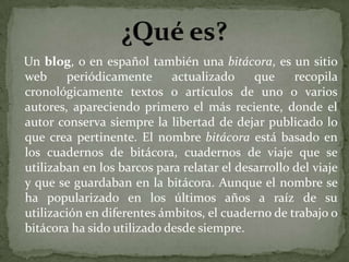 Un blog es un sitio web periódicamente actualizado que recopila cronológicamente artículos de uno o más autores. Existen herramientas gratuitas para crear y administrar blogs de manera sencilla, ya sea a través de alojamiento gratuito o mediante software de gestión de contenido. Los blogs permiten añadir comentarios, enlaces, fotografías, vídeos y usar formatos como RSS para su distribución.