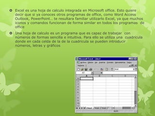 Excel puede utilizarse para realizar cálculos, sumas y simulaciones de forma sencilla. Permite introducir números, texto y fórmulas en una cuadrícula de celdas y recalcular automáticamente los resultados cuando se modifican los datos de entrada. Ofrece también funciones para trabajar con fechas y porcentajes.