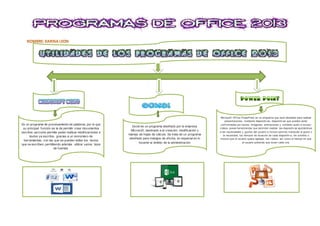 Este documento resume las funciones de tres programas de Microsoft Office: Word, Excel y PowerPoint. Word es un procesador de texto que permite crear y editar documentos usando diferentes fuentes y herramientas. Excel es un programa de hojas de cálculo diseñado para tareas administrativas y de oficina. PowerPoint permite crear presentaciones con diapositivas que incluyen texto, imágenes, videos y audio, y ofrece herramientas para personalizar los tiempos y elementos en cada diapositiva.