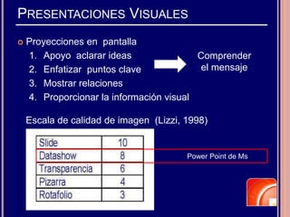 Este documento proporciona normas y consejos para realizar presentaciones efectivas utilizando PowerPoint. En resumen, recomienda: 1) Limitar la información por diapositiva siguiendo la regla 6x6; 2) Usar imágenes en lugar de texto para captar la atención; 3) Utilizar pocos colores contrastantes de forma coherente; 4) No exceder los 2-3 minutos por diapositiva. El objetivo es transmitir el mensaje de forma clara, sencilla y atractiva.