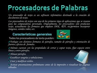Este documento describe los procesadores de texto, que son software para crear documentos de texto e incorporar imágenes, sonidos y video. Incluye características como formatos de párrafos, alineación, y estilos. También discute ventajas como correctores ortográficos y desventajas como incompatibilidad de versiones. Finalmente, menciona ejemplos de software libre, comercial y en línea para procesamiento de texto.