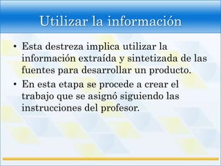 Este documento describe cómo utilizar la información como una de las competencias de información. Explica que implica crear un producto final siguiendo las instrucciones del profesor utilizando la información extraída y sintetizada de las fuentes. Además, detalla los pasos básicos para crear el producto final como organizar los datos, redactar el trabajo siguiendo un manual de estilo, y citar y reconocer a los autores de la información utilizada.