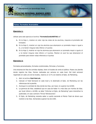 Este documento presenta una serie de ejercicios prácticos de MS Excel de nivel avanzado. Incluye temas como formatos avanzados, fórmulas y funciones, filtros automáticos, gráficos e integración de conceptos. Los ejercicios cubren temas como formatos condicionales, referencias mixtas, funciones lógicas y de fecha, cálculos financieros y más. El objetivo es que los participantes practiquen y apliquen sus conocimientos sobre herramientas avanzadas de Excel.