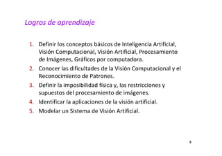 La inteligencia artificial (IA) intenta crear programas que imiten la inteligencia humana mediante el desarrollo de agentes. La visión artificial (VA) es parte de la IA y se enfoca en procesar y analizar imágenes digitales para entender escenas. El procesamiento digital de imágenes (PDI) transforma imágenes mediante operaciones como filtros. El reconocimiento de patrones identifica objetos en imágenes. La visión computacional reconstruye escenas 3D a partir de imágenes 2D. Los gráficos por computadora generan imágenes