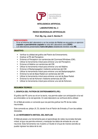 Este documento presenta las instrucciones para el Laboratorio No. 2 sobre Redes Neuronales Artificiales. El objetivo del laboratorio es entrenar diferentes tipos de redes neuronales (Perceptron, Adaline, Backpropagation, Base Radial y Kohonen) utilizando comandos de MATLAB y la herramienta nntool. Se explican los pasos para graficar el patrón de entrenamiento, crear y entrenar cada tipo de red tanto con comandos como con la herramienta. Adicionalmente, se presentan ejemplos de funciones lógicas y expresiones para
