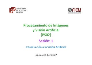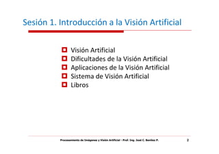 El documento presenta una introducción a la visión artificial. Explica conceptos clave como visión artificial, procesamiento de imágenes y reconocimiento de patrones. También describe las dificultades de la visión artificial como el mapeo de múltiples superficies 3D a una imagen 2D y la falta de una solución única para el mapeo inverso. Finalmente, presenta algunas aplicaciones como el control de calidad en la industria y la biometría.