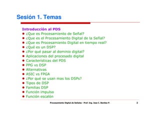 El documento presenta una introducción al procesamiento digital de señales. Explica conceptos clave como procesamiento de señal, procesamiento digital de señal, procesamiento digital en tiempo real y DSP. También describe aplicaciones comunes como procesamiento de voz y audio, e introduce alternativas de implementación como ASIC, FPGA y DSP. Finalmente, resume tipos y familias populares de DSP y conceptos matemáticos como la función impulso y escalón.