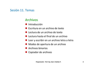 El documento presenta una sesión sobre archivos en programación. Explica las cinco operaciones básicas con archivos: declarar la variable archivo, abrir el archivo, leer datos, escribir datos y cerrar el archivo. También cubre temas como la escritura y lectura de archivos de texto, lectura hasta el final de un archivo, lectura y escritura de archivos letra a letra, y los diferentes modos de apertura de archivos. Por último, introduce el concepto de archivos binarios y las funciones fread y fwrite para leer y escribir bloques de