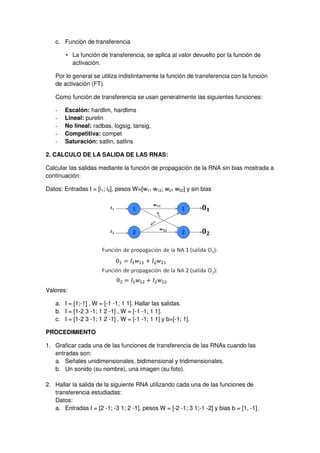 Este documento describe las funciones básicas de las redes neuronales artificiales, incluidas las funciones de propagación, activación y transferencia. Explica cómo calcular la salida de una red neuronal dada las entradas, pesos y función de transferencia. También detalla los procedimientos del laboratorio para graficar funciones de transferencia comunes y calcular la salida de varias redes neuronales de ejemplo.