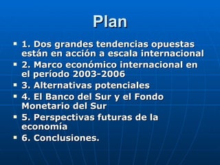 El documento describe dos tendencias opuestas en la economía internacional, con la tendencia neoliberal dominante enfrentada a una contratendencia en América Latina. También discute el marco económico internacional entre 2003-2006, con Estados Unidos como locomotora y China impulsando la demanda de materias primas. Propone alternativas como el Banco del Sur y Fondo Monetario del Sur para canalizar las reservas de los países en desarrollo hacia inversiones productivas en lugar de deuda, con control popular y un enfoque socialista.