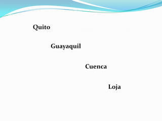 Este documento presenta información sobre 4 ciudades principales del Ecuador: Quito, Guayaquil, Cuenca y Loja. Proporciona detalles sobre la ubicación, población e importancia de cada ciudad como capital provincial y centros urbanos, culturales y económicos del país.