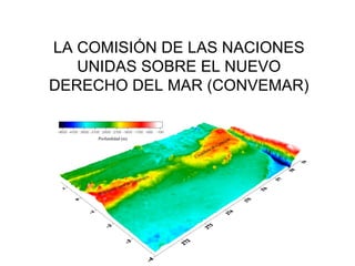 La Convención de las Naciones Unidas sobre el Derecho del Mar de 1982 (CONVEMAR) establece un marco jurídico completo para los océanos y mares. Define zonas marítimas como aguas interiores, mar territorial, zona contigua y zona económica exclusiva, y norma aspectos como jurisdicción soberanía y recursos. También aborda conservación ambiental, investigación científica y solución de controversias. Es considerada la "Constitución de los océanos".