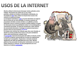 Internet es una red mundial de millones de computadoras interconectadas que permite a los usuarios descargar música, películas y videos, acceder a noticias, chatear y enviar correo electrónico. También se usa para publicar fotos y comentarios personales, y sitios como YouTube ofrecen una gran variedad de videos sobre cualquier tema. Aunque la pornografía representa una parte importante del tráfico en Internet, muchos gobiernos han tratado sin éxito de regular su uso debido a las implicaciones morales.
