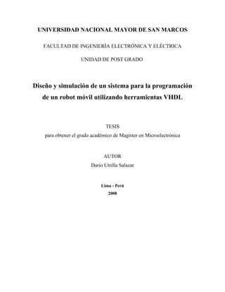Este documento presenta la tesis de Dario Utrilla Salazar para obtener el grado de Magíster en Microelectrónica. La tesis describe el diseño y simulación de un sistema de control para un robot móvil utilizando herramientas VHDL. El sistema controla los motores del robot para moverse a posiciones finales especificadas a través de una computadora conectada por puerto serie. El robot usa sensores de un mouse PS/2 para determinar su posición. El diseño fue simulado e implementado en un dispositivo FPGA para validar el sistema