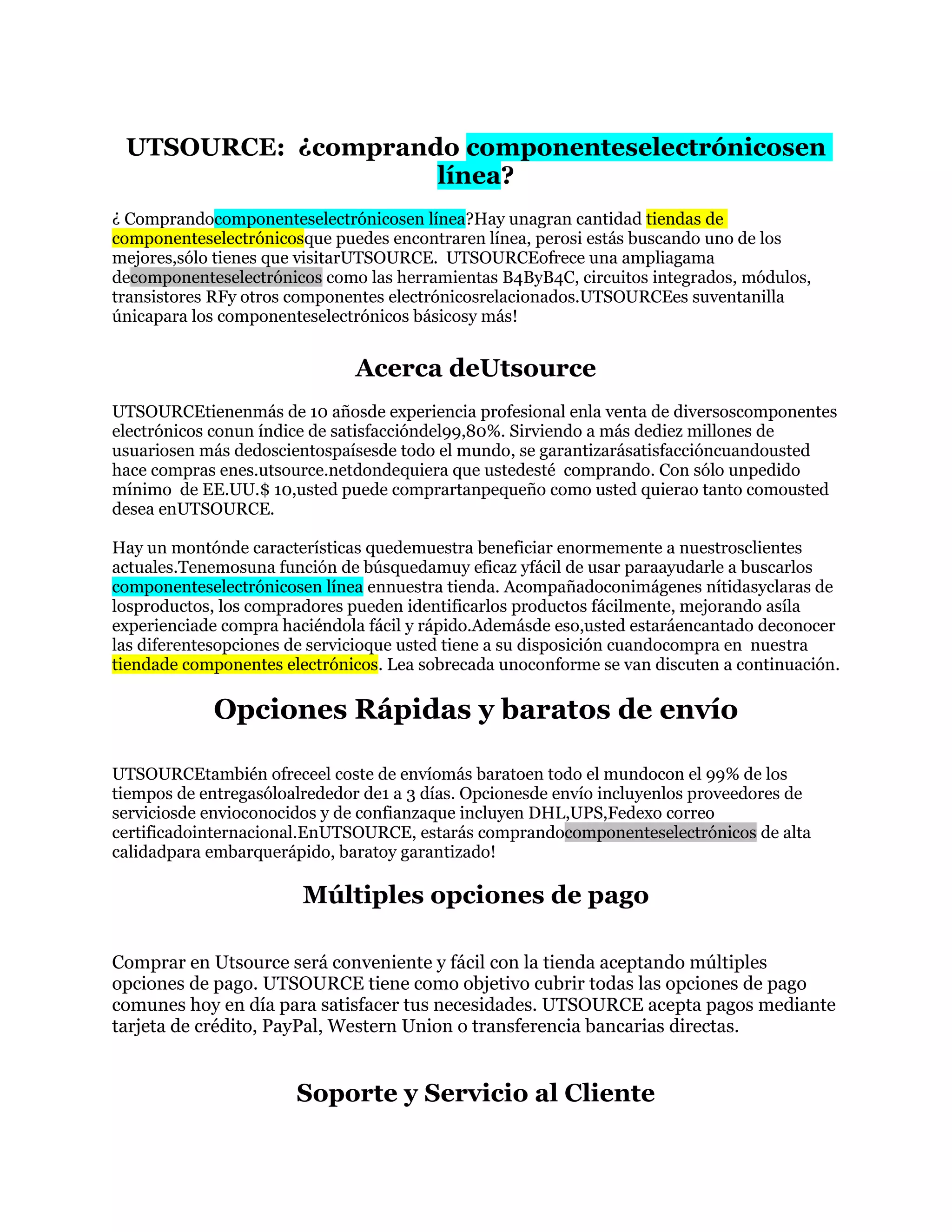UTSOURCE ofrece una amplia gama de componentes electrónicos a bajo costo, con envíos rápidos de 1 a 3 días a través de proveedores como DHL y UPS. Aceptan múltiples métodos de pago como tarjetas de crédito, PayPal y transferencias bancarias. Su personal de servicio al cliente está disponible para ayudar a los clientes con consultas, pedidos y seguimiento a través de llamadas, correo electrónico o chat en línea.