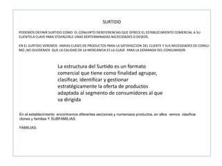 El documento habla sobre el concepto de surtido. Explica que el surtido es el conjunto de referencias que ofrece un establecimiento comercial a sus clientes para satisfacer sus necesidades. Describe que en el surtido se verán diferentes clases de productos organizados en una estructura de departamentos, secciones, categorías de producto, familias y subfamilias. Resalta que la calidad de los productos es clave para la demanda de los consumidores.