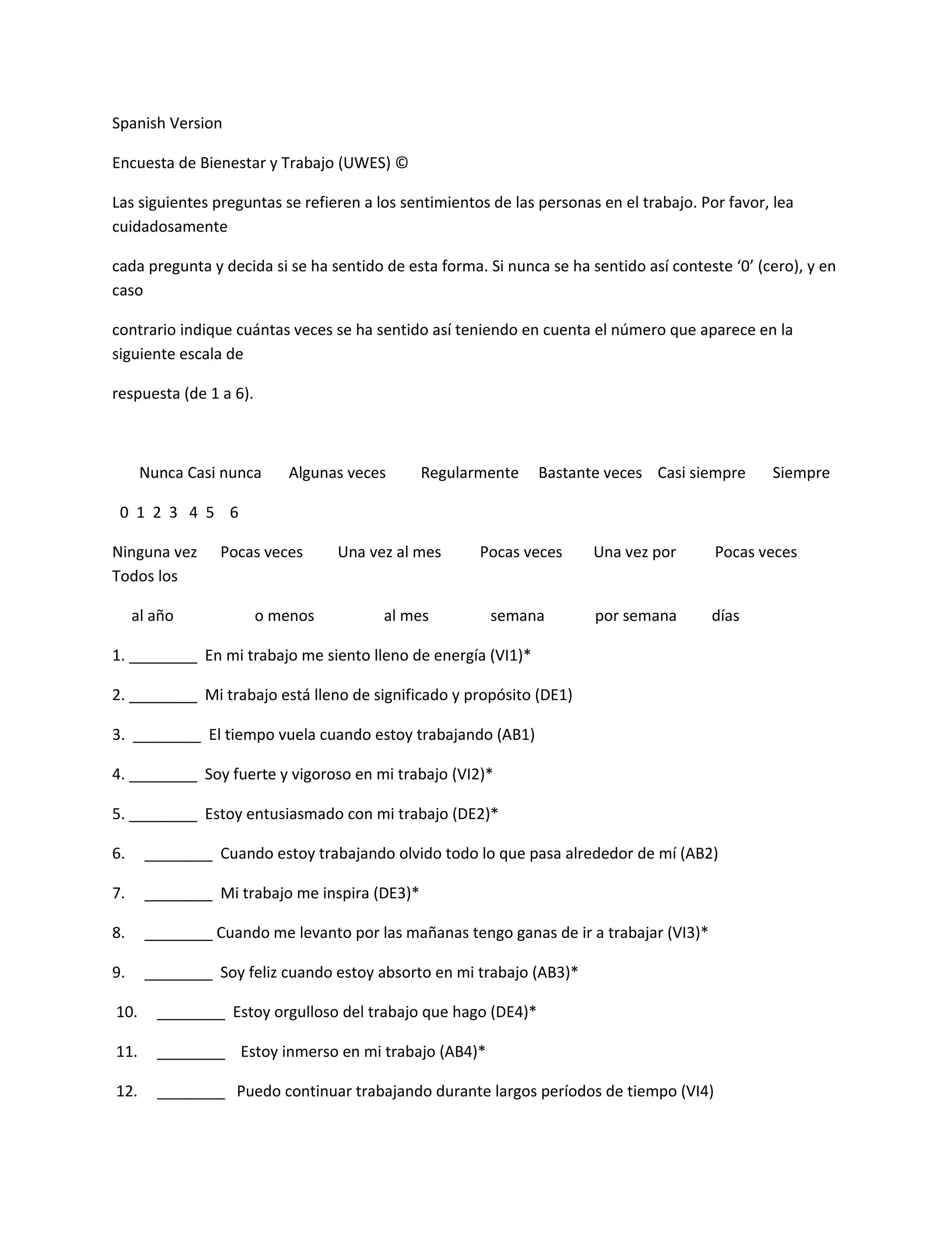 Este documento presenta una encuesta de 17 preguntas sobre los sentimientos de las personas en el trabajo. La encuesta mide tres dimensiones principales del bienestar laboral: la vigor, la dedicación y la absorción. Los participantes deben indicar con qué frecuencia han experimentado cada sentimiento usando una escala de 0 a 6.