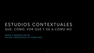 El documento trata sobre estudios contextuales y su importancia en la investigación de usuarios, destacando diversas técnicas para entender comportamientos y necesidades. Resalta la relevancia de observar a los usuarios en su entorno para obtener información más auténtica y aplicable. Se concluye que el desarrollo de estos estudios es vital para poblaciones vulnerables y subraya la necesidad de un manejo ético de la información recolectada.