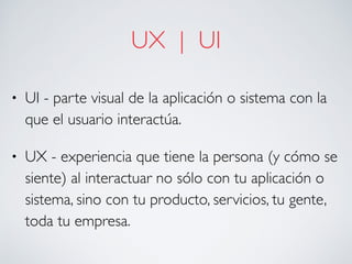 Este documento describe los conceptos de UX (experiencia de usuario), UI (interfaz de usuario) y usabilidad en el diseño de interfaces. Explica que la UX se refiere a la experiencia completa del usuario al interactuar con un producto o servicio, mientras que la UI es la parte visual con la que interactúa directamente. También destaca la importancia de conocer al usuario a través de perfiles, personas y enfoques centrados en el usuario, así como probar iterativamente la interfaz con usuarios reales para garantizar su usabilidad mediante métricas como la