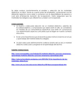 Este ensayo discute el rol importante que juegan los materiales didácticos dentro del proceso de enseñanza-aprendizaje. Explica que los materiales didácticos bien seleccionados pueden facilitar y potenciar la enseñanza al captar el interés de los estudiantes. También destaca que es crucial que los docentes estén bien capacitados para crear nuevos materiales y métodos que hagan el aprendizaje más sencillo y útil para los estudiantes. Finalmente, concluye que una buena selección de materiales didáct