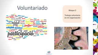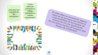 El documento habla sobre el trabajo voluntario en una organización y plantea preguntas sobre cómo gestionar a los voluntarios y promover el voluntariado.