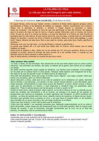 Este documento resume un pasaje del Evangelio de Juan sobre la última cena de Jesús. Jesús les dice a sus discípulos que su hora ha llegado y que morirá para dar mucho fruto. Añade que aquel que quiera seguirlo debe estar dispuesto a servir y a ser premiado por el Padre. Jesús expresa su temor ante lo que va a ocurrir pero acepta la voluntad del Padre. Luego, una voz desde el cielo declara que Jesús será glorificado. Jesús anuncia que el Príncipe de este mundo será derrotado y que