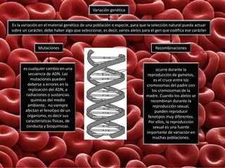 La variación genética en una población o especie proviene de mutaciones en el ADN, recombinaciones cromosómicas durante la reproducción sexual, y de la presencia de diferentes alelos para un gen. Estas fuentes de variación genética permiten que la selección natural actúe sobre los caracteres de un organismo.