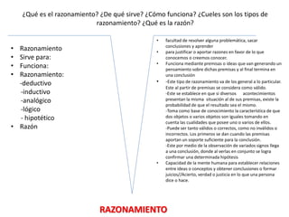 Este documento define qué es un problema y los tipos de problemas que existen. Explica que un problema se puede resolver de manera secuencial identificando el problema, analizando los datos, generando soluciones potenciales, seleccionando una solución, aplicándola y evaluándola. También describe los tipos de razonamiento como deductivo, inductivo, analógico, lógico e hipotético, y define la razón como la facultad de resolver problemas y sacar conclusiones.