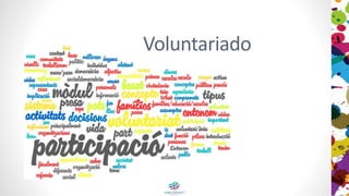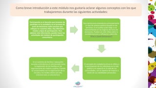 Este documento presenta conceptos clave sobre la participación ciudadana, la democracia y el voluntariado. Explica que el voluntariado implica la participación de las familias en organizaciones escolares sin recibir una compensación económica. El módulo se centra en el voluntariado de las familias en las escuelas y cómo se basa en la motivación, la conciliación y los aspectos legales.