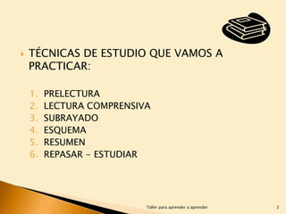 El documento describe seis técnicas de estudio: prelectura, lectura comprensiva, subrayado, esquema, resumen y repasar-estudiar. Explica que estas técnicas ayudan a mejorar el rendimiento académico mediante una lectura activa, organización de ideas y repaso regular.